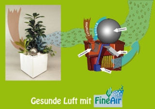 FineAir ist eine Innovation aus Hydrokultur und Luftreiniger, die ab sofort für bessere Luft in Ihren Innenräumen sorgen kann. Es reinigt die Luft durch ein modernes Luft-Wasser-Filtersystem und bereichert gleichzeitig Ihre Wohn- und Büroräume durch den Anblick gesunder und üppiger Pflanzen - pflegeleicht und günstig.
